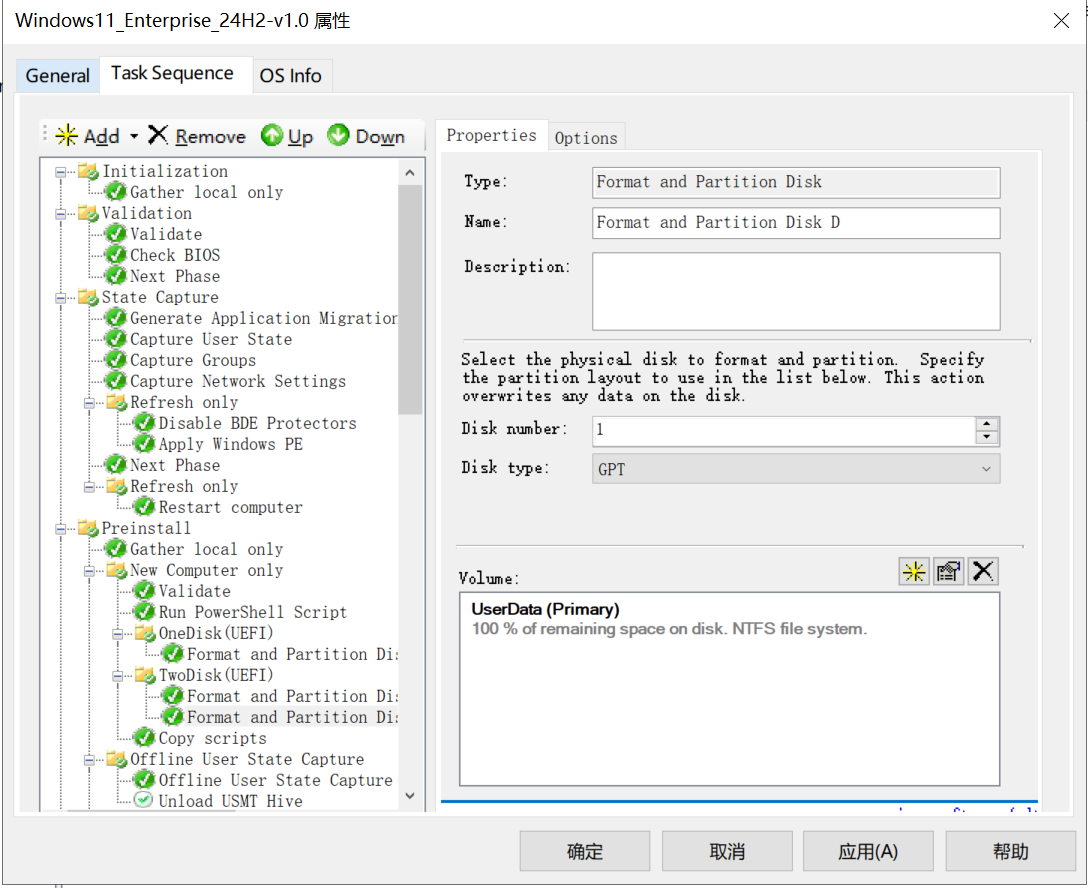 # 获取所有物理磁盘 $disks = Get-WmiObject -Class Win32_DiskDrive $internalCount = 0 foreach ($disk in $disks) { # 检查是否为USB设备 $isUSB = $disk.InterfaceType -eq "USB" -or $disk.PNPDeviceID -like "*USB*" # 检查是否为可移动设备 $isRemovable = $disk.MediaType -eq "Removable Media" -or $disk.MediaType -eq "External hard disk media" if (-not $isUSB -and -not $isRemovable) { $internalCount++ } } # 设置MDT环境变量 try { $tsenv = New-Object -COMObject Microsoft.SMS.TSEnvironment $tsenv.Value("InternalDiskCount") = $internalCount Write-Output "已设置MDT环境变量 InternalDiskCount = $internalCount" } catch { # 如果不在MDT环境中,设置进程环境变量 [Environment]::SetEnvironmentVariable("InternalDiskCount", $internalCount, "Process") Write-Output "已设置进程环境变量 InternalDiskCount = $internalCount" } - 下方添加组“OneDisk(UEFI)” - Options - Add“Task Sequence Variable Condition”